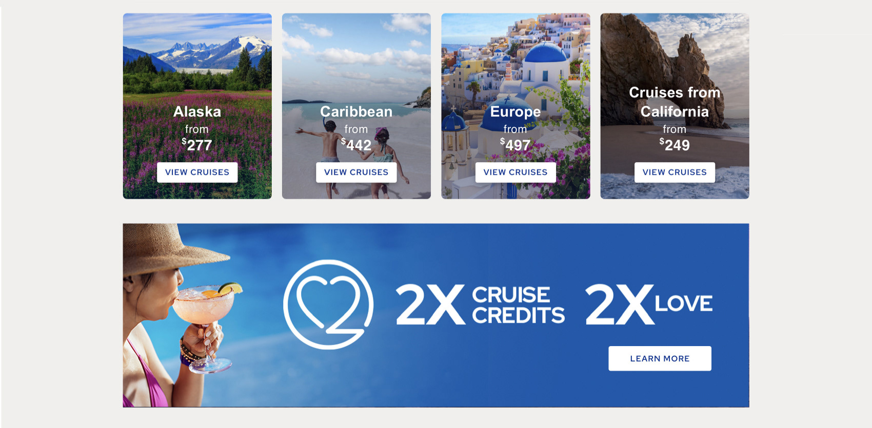 For this loyalty campaign, I collaborated closely with the copywriting team and Creative Director to craft a creative direction that effectively communicated the value and exclusivity of offering double cruise credits to our Princess guests.